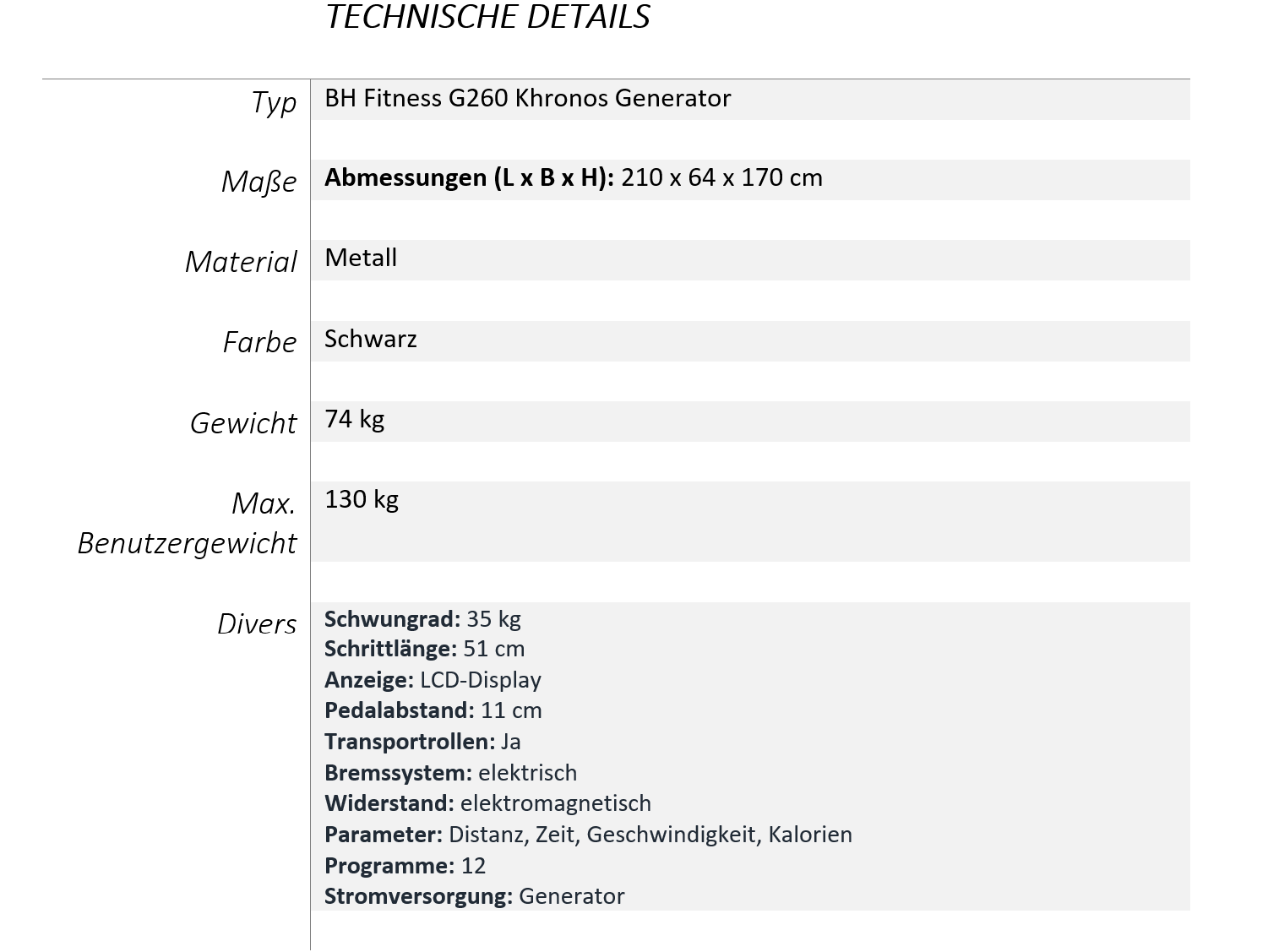 - Crosstrainer BH G260 Khronos. Mindestabstand zwischen den Pedalen. Elektromagnetischer Widerstand, 12 Programme. SWR.