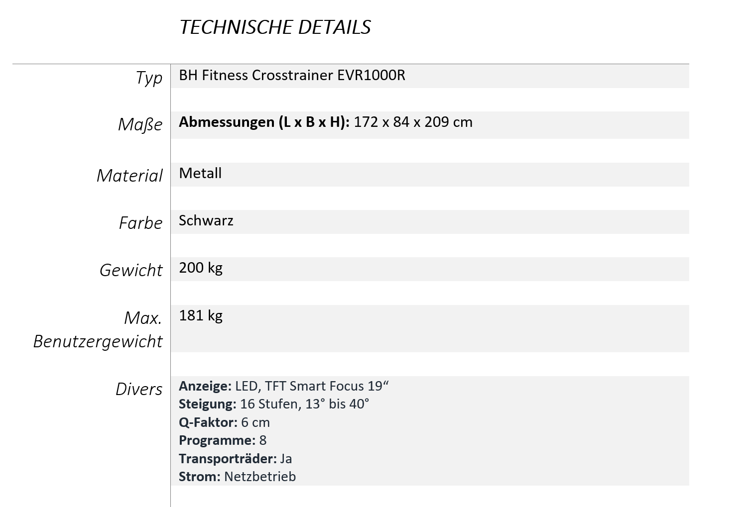 - 8 voreingestellte Programme, HRC, Benutzer, Handbuch, Fitnesstest und mehr