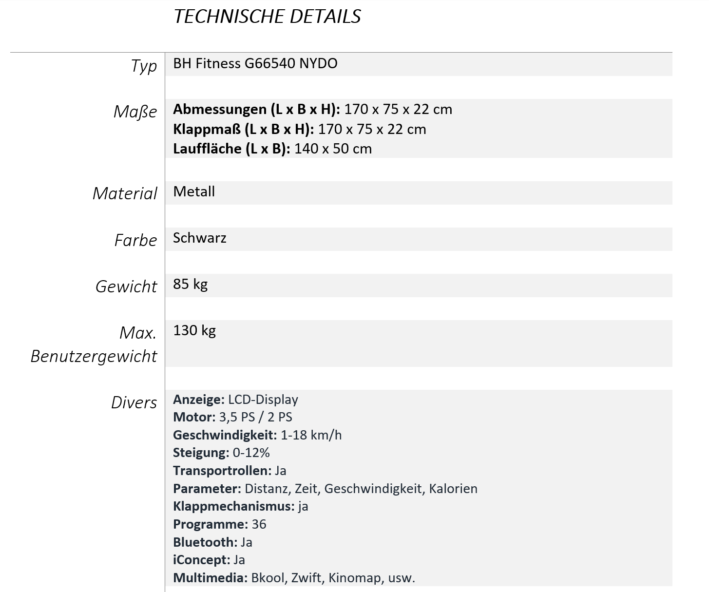 Zusammenklappbares BH Fitness Laufband Nydo G6540 für Personen, die auf einem stabilen und sicheren Gerät gehen oder laufen wollen. Sein vertikales und horizontales Falt- und Aufbewahrungssystem macht es perfekt für Benutzer mit Platzproblemen zu Hause. Die Mindestgeschwindigkeit beträgt 1 km/h und erhöht sich in 0,10 Schritten um 0,10.