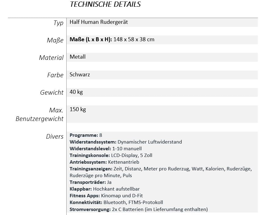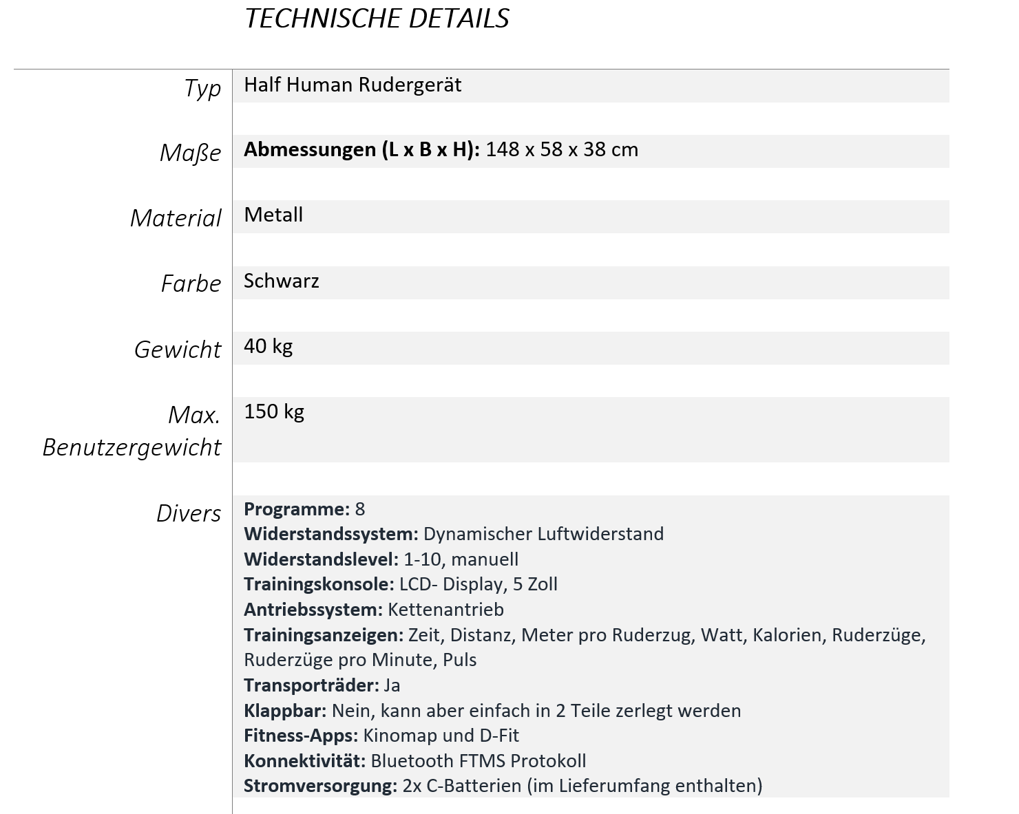 - Stabilität: Die gesamte Konstruktion des Half Human Air Rower ist auf Robustheit und Langlebigkeit gedrillt. Das maximale Benutzergewicht liegt bei 150 kg. Der Air Rower ist ein Klasse S Gerät und damit für den kommerziellen Einsatz zugelassen.