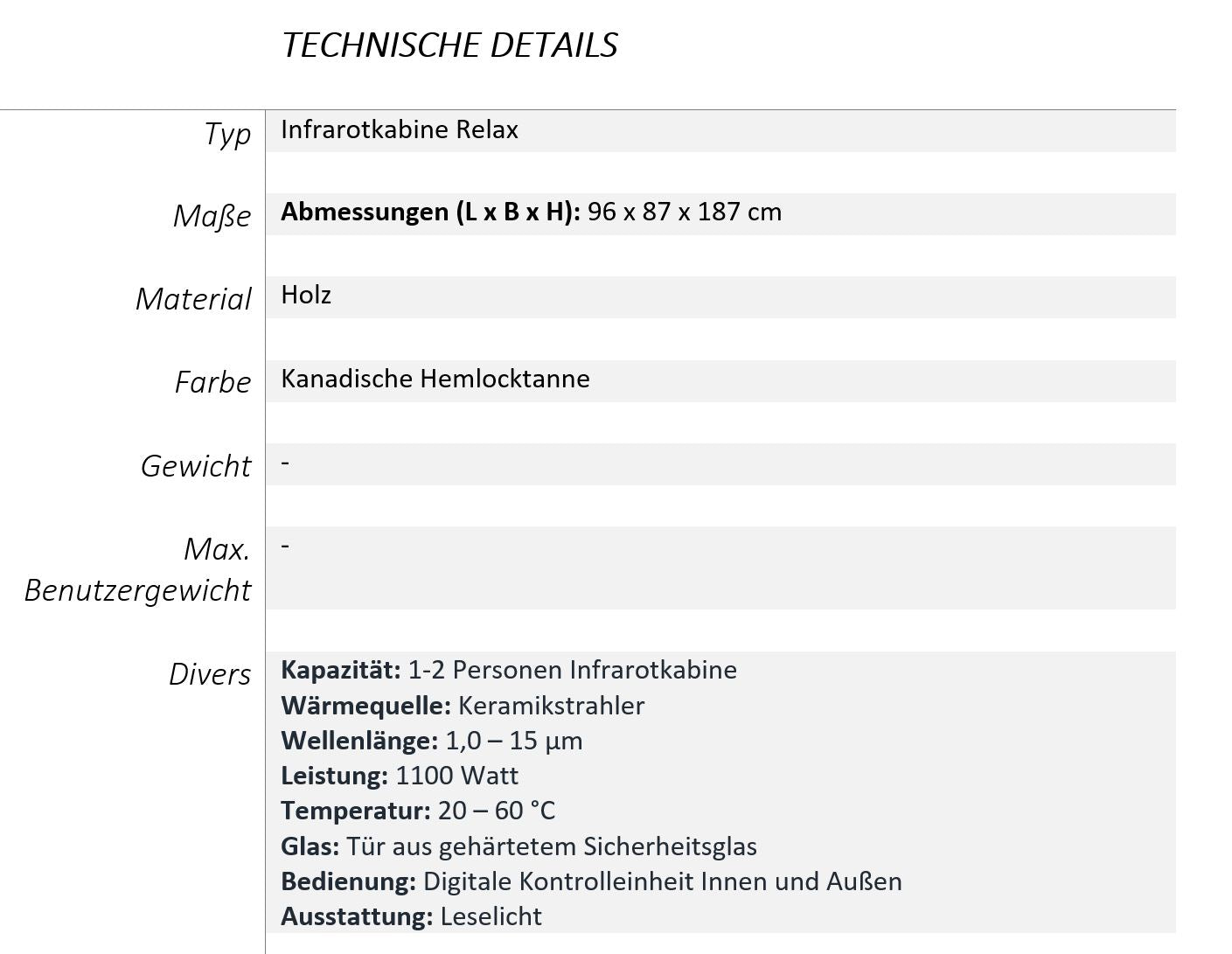 Mit der Infrarotkabine Relax kannst Du den Stress des Tages hinter Dich lassen um wieder neue Kraft zu tanken. Deine verspannten Muskeln werden entlastet und Deine Seele erhält wieder neues Wohlbefinden!