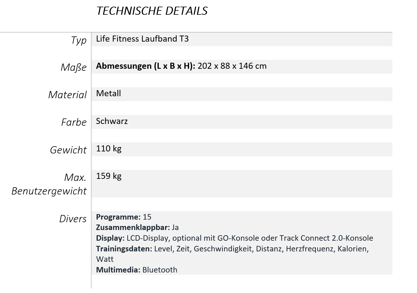 Das Laufband T3 bietet dem geneigten Läufer eine 153 cm lange und 51 cm breite und somit auch für höhere Laufgeschwindigkeiten ausgelegte Lauffläche. Das FlexDeck-Stoßdämpfungssystem mit LifeSpring-Elastomere bietet hervorragende Dämpfungseigenschaften und ein besonders gelenkschonendes Trainingserlebnis auf dem T3. LifeSpring-Elastomere verringern den Rückstoß, welche durch das Auftreten auf das Laufdeck entstehen, um bis zu 30 % im Vergleich zum Laufen im Freien.