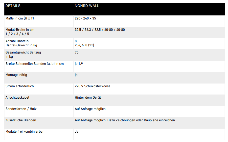 Gesamtgewicht des Moduls ca. 120 kg. Die Höhe ist von 220-240 cm wählbar. Abschluss- und Sichtblenden sind verfügbar. Unser Service-Team wird sich nach der Bestellung bei Dir melden, um alle Details zu besprechen.