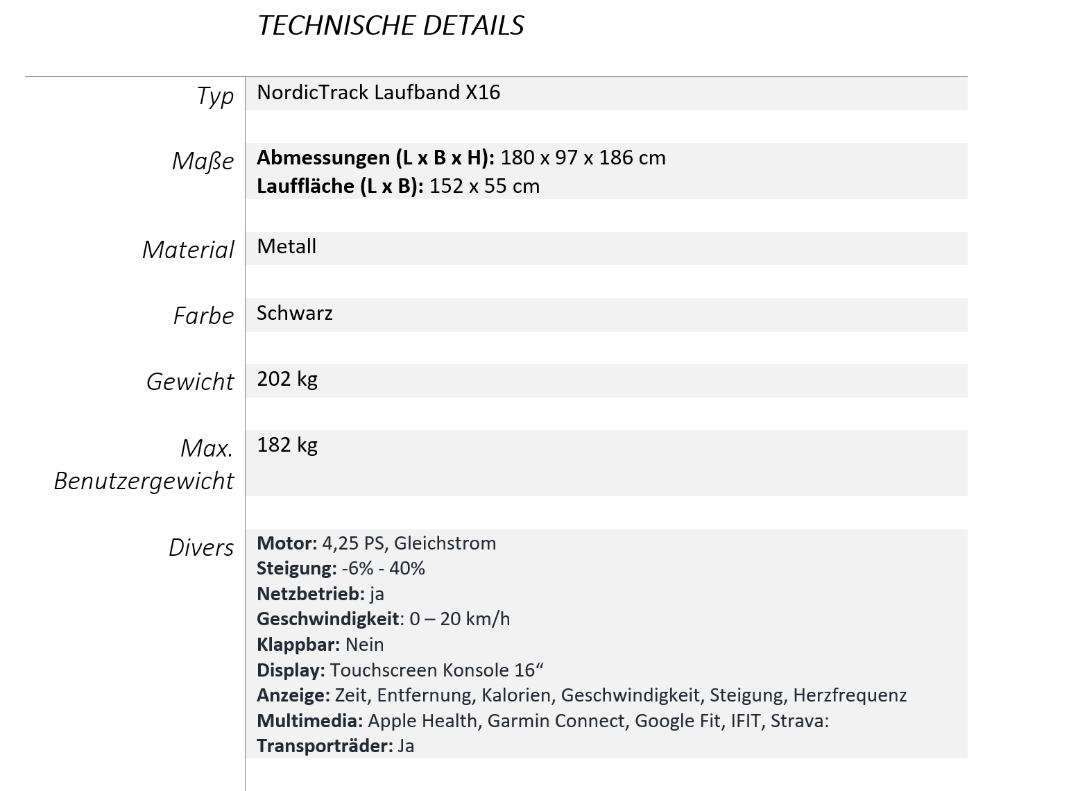 Das NordicTrack X16 Laufband wurde entwickelt, damit sich jedes Training genau richtig anfühlt. Mit einem leistungsstarken 4,25-Motor passt er sich sanft an jedes von Dir eingestellte Tempo an. Der Steigungsbereich des Laufbandes – von einem Gefälle von 6 % bis zu einer steilen Steigung von 40 % – gibt Dir die Flexibilität, Deine Routine mit allem zu mischen, von flachen Läufen bis hin zu Bergaufwanderungen. Der 16-Zoll-HD-Touchscreen lässt sich drehen, sodass Du das Training aus jedem Winkel verfolgen können, egal ob auf oder neben dem Laufband. Mit SmartAdjust passt der X16 Deine Geschwindigkeit und Steigung automatisch an Deinen Trainingsplan an, sodass Du nur noch mitmachen musst. Die ActivePulse-Technologie™ in Kombination mit einem Herzfrequenzmesser (separat erhältlich) hilft Dir, in Deiner Zielzone zu bleiben und die Trainingsintensität an Deine Herzfrequenz anzupassen. Die SpringFlex-Dämpfung™ macht jeden Schritt weicher und trägt so dazu bei, die Belastung Deiner Gelenke zu reduzieren. Was das X16 wirklich auszeichnet, ist iFIT 2.0, das interaktives Training. iFIT 2.0 bietet ein frisches, benutzerfreundliches Design mit einfacherer Navigation, schnellen Trainingszusammenfassungen, mehrsprachigem Audio, Streaming Deiner Lieblingssendungen während der Fahrt und vielem mehr. Jedes Teil des X16 ist so gestaltet, dass Dein Training perfekt auf Deine Bedürfnisse abgestimmt ist!