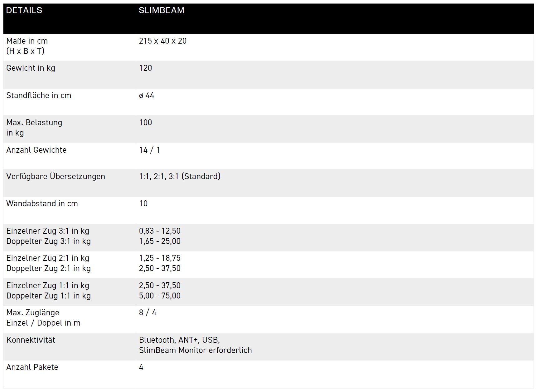 Die Übersetzung lässt sich beim SlimBeam Kabelzug durch einen Tausch des Zugseils ändern. Somit sind Übersetzungen von 3:1, 2:1 und 1:1 möglich. Das effektiv an den Körper gelangende Maximalgewicht von 12,5 kg (Einzelzug) bzw. 25,0 kg (Doppelzug), verteilt auf 15 Gewichtsscheiben, ergibt eine sehr feine und harmonische Gewichtsabstufung.