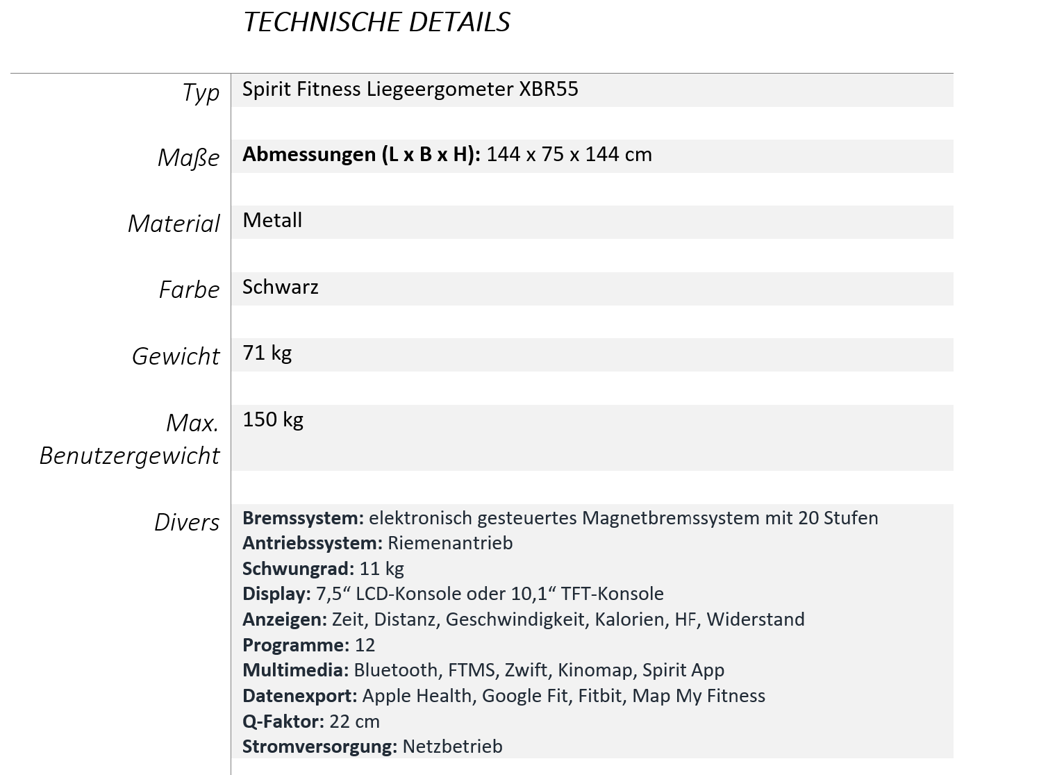 Das Spirit Fitness XBR55 Black überzeugt mit einer Ausstattung, die selbst höchsten Ansprüchen gerecht wird. Gefertigt aus einem robusten, pulverbeschichteten Stahlrahmen, bietet dieses Liegeergometer außergewöhnliche Stabilität und Langlebigkeit. Mit einer maximalen Benutzergewichtsbelastung von bis zu 150 kg ist es nicht nur für den privaten Gebrauch, sondern auch für den Light Commercial Einsatz in kleinen Fitnessstudios, Hotels oder Rehabilitationseinrichtungen geeignet.