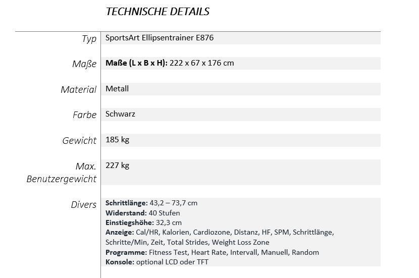 Die ECO-NATURAL™ Status-Linie von SportsArt verkörpert Design, Technologie, Mobilität und kardiovaskuläre Exzellenz. Das schlanke Design Winkel und Premium-Features verbinden sich mit einem Generator Design und dem optionalen SENZA-Touchscreen™ für das spannendste Training für die Nutzer. Der E876 Ellipsentrainer bietet ein wirkungsarmes, äußerst effektives Training mit Funktionen wie: verstellbarer 17-29" Schrittlänge, Schalter und Fingertippbedienungen, 3-Gang-Lüfter und einzigartigem Design.