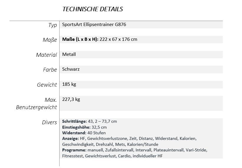 Die ECO-POWR™ Status-Linie von SportsArt verkörpert Design, Technologie, Nachhaltigkeit und kardiovaskuläre Exzellenz. Das elegante Design und hochwertige Funktionen verbinden sich mit modernster Energieerzeugungstechnologie und sorgen für das spannendste Training, bei dem sich Nutzer freuen können. Der G876 Ellipsentrainer bietet ein schonendes und leistungsintensives Training mit Funktionen wie: verstellbarer Schrittlänge von 17–29", Schaltern und Fingertippbedienungen, 3-Gang-Lüfter und einzigartigem Design.