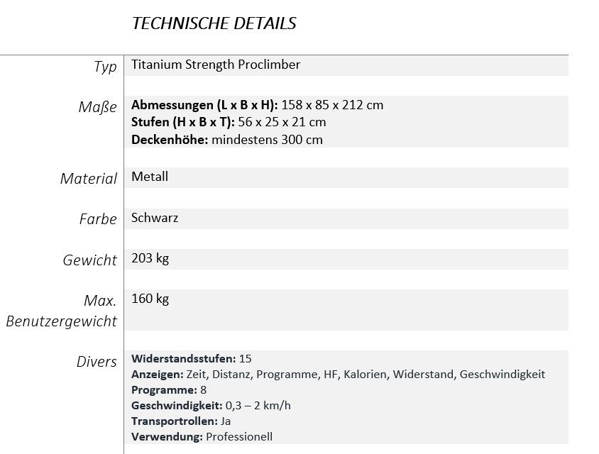 Der ProClimber Stair Climber von Titanium Strength ist der perfekte Stepper für jedes Fitnessstudio, um ein überragendes Trainingserlebnis zu bieten. Der professionelle Stairmaster ProClimber integriert automatische Sicherheitsfunktionen, einen Herzfrequenzmonitor und ein intuitives LED-Display, das alle wichtigen Trainingsdaten anzeigt. Mit 15 Widerstandsstufen verbessert er die kardiovaskuläre Gesundheit, stärkt die Muskeln und fördert die Knochengesundheit der Nutzer, während er ein effizientes und sicheres Training bietet. Darüber hinaus gewährleisten seine robusten Komponenten eine lange Lebensdauer bei intensiver Nutzung, was den ProClimber Climbmill zur idealen Wahl für Einrichtungen macht, die Wert auf Leistung und Sicherheit legen.