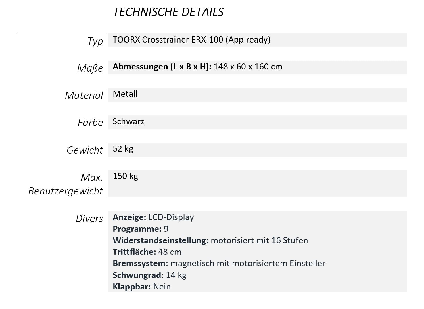 Der TOORX Crosstrainer ERX-100 ist mit einem Herzfrequenzmesser, einem elektromagnetischen Widerstand mit nicht weniger als 16 Widerstandsstufen ausgestattet. Er hat ein Schwungradsystem von 14 kg und ein maximales Benutzergewicht von 150 kg.
