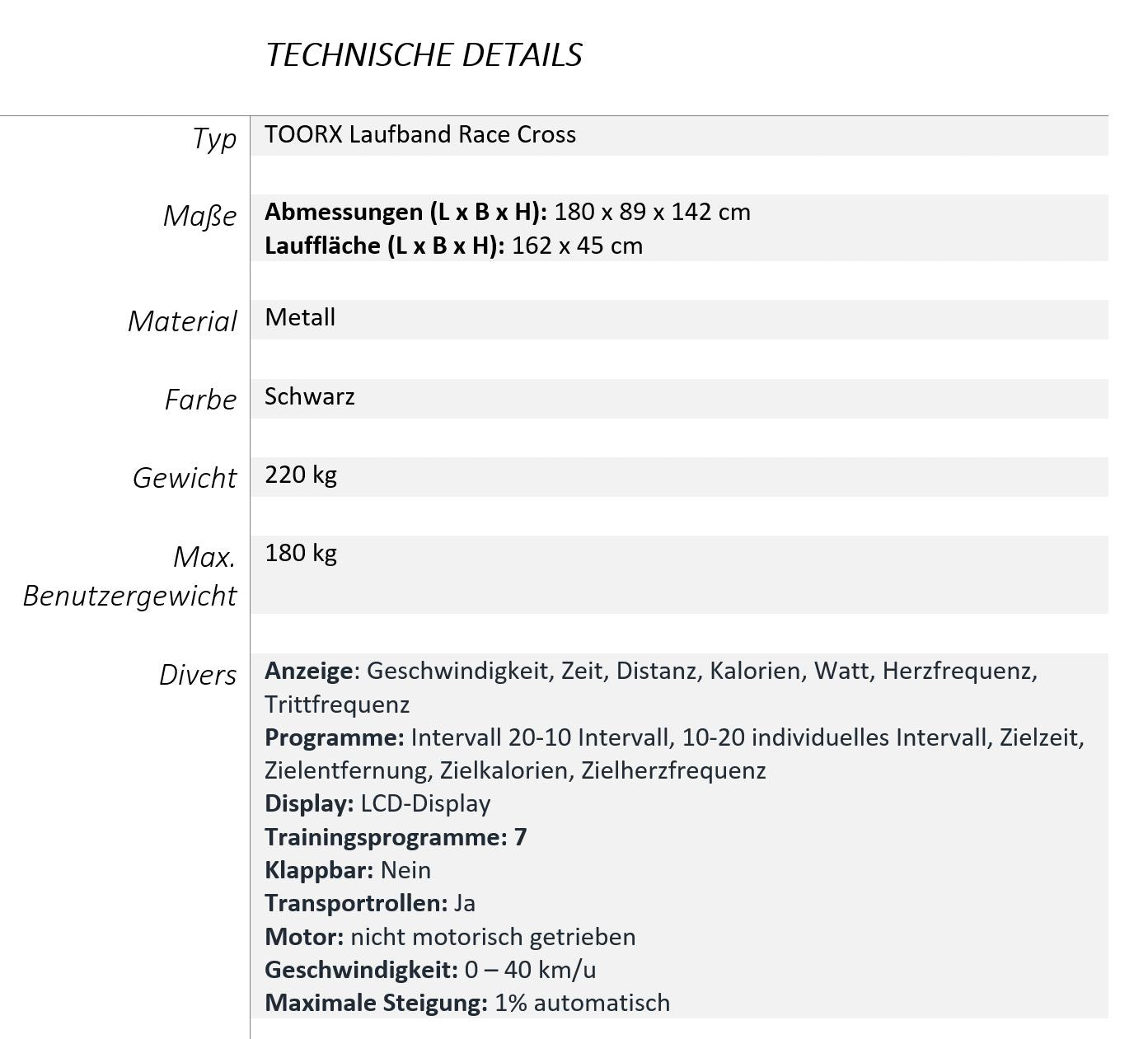 Mit dem TOORX Laufband Race Cross verbesserst Du Deine Kraft, Geschwindigkeit, Widerstandsfähigkeit und Beweglichkeit und bringst Abwechslung in Dein Workout. Diese einzigartige Laufband ermöglich Dir ein sehr effektives Intervalltraining durchzuführen.