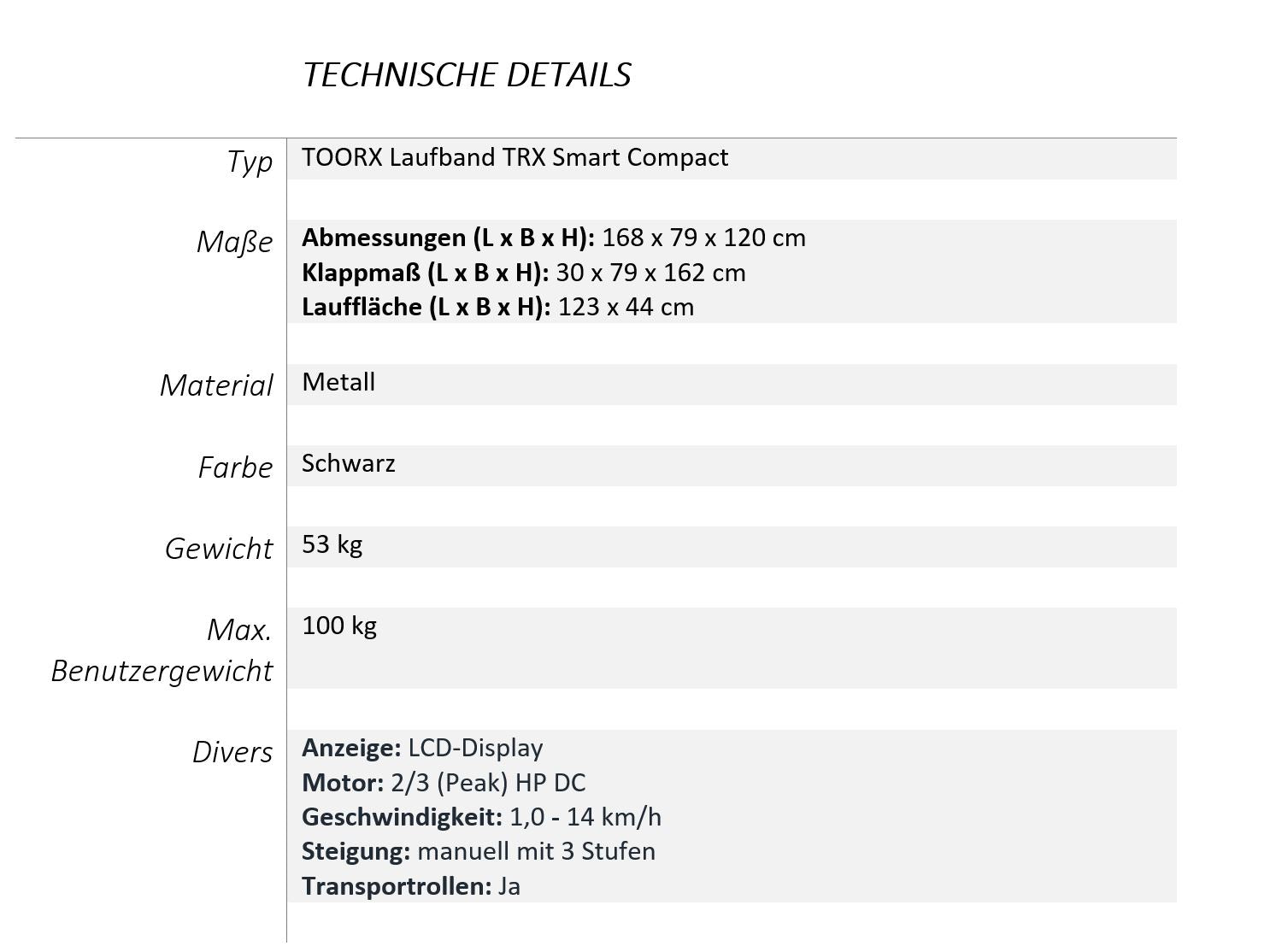 Das Laufband TRX-Smart Compact von TOORX ist ideal für diejenigen, die ein Qualitätsprodukt wünschen. Dieses Laufband ist mit einem Motor mit einer Dauerleistung von 2 PS mit einer Spitzenleistung von 3 PS ausgestattet und ermöglicht eine Höchstgeschwindigkeit von 14,0 km/h mit einer Steigerung von 0,1 km/h, sowie einer manuellen Neigungauf 3 Ebenen. Die Struktur ist vormontiert und sehr robust, tatsächlich wiegt das Laufband 53,5 kg und kann Dich mit einem maximalen Gewicht von 100 kg tragen.