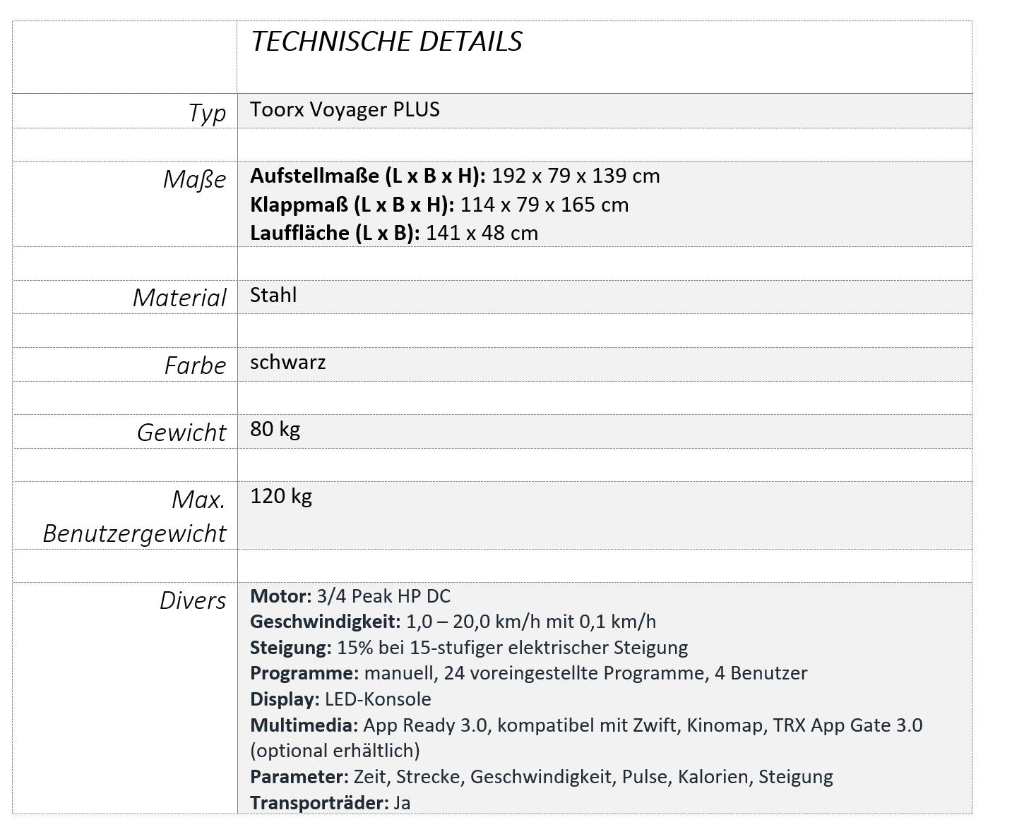 Das Toorx Voyager Plus Laufband hat eine stabile und robuste Struktur, wiegt ca. 80 kg und kann einen Benutzer mit einem maximalen Gewicht von 120 kg tragen.