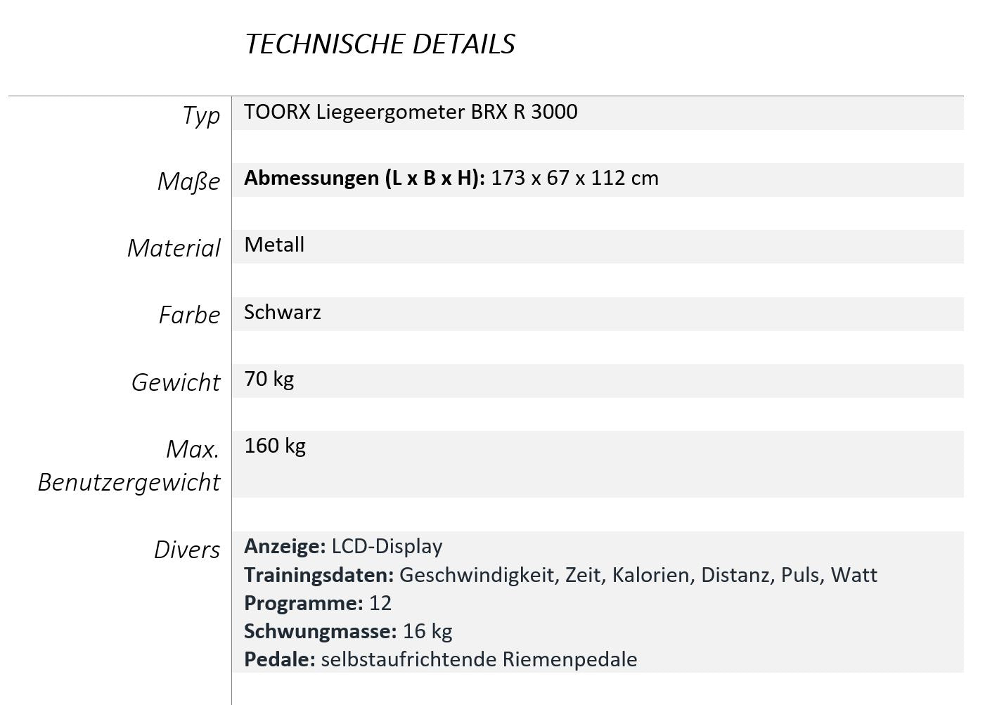 Der Liegeergometer BRX R3000 von TOORX verfügt über einen Induktions-Magnetwiderstands und eine elektronische Belastungsanpassung mit 32 Stufen, sowie einem Schwungrad von 16 kg.