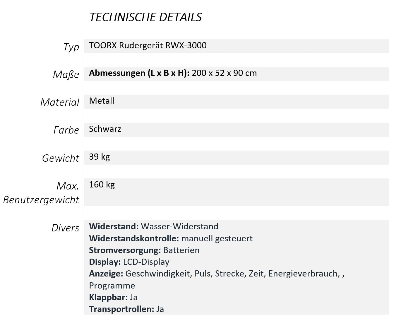 Das Toorx RWX-3000 Wasserrudergerät verfügt über 6 verschiedene Widerstände und der eingebaute Herzfrequenz-Empfänger ermöglicht es Dir, Deine Herzfrequenz drahtlos zu messen. Mittels eines Klappsystems kannst Du Dein Rudergerät so kippen, dass es platzsparend verstaut werden kann. Das Rudergerät von Toorx ist für eine intensive Nutzung ausgelegt und gehört somit zur Professionellen Linie von Toorx.