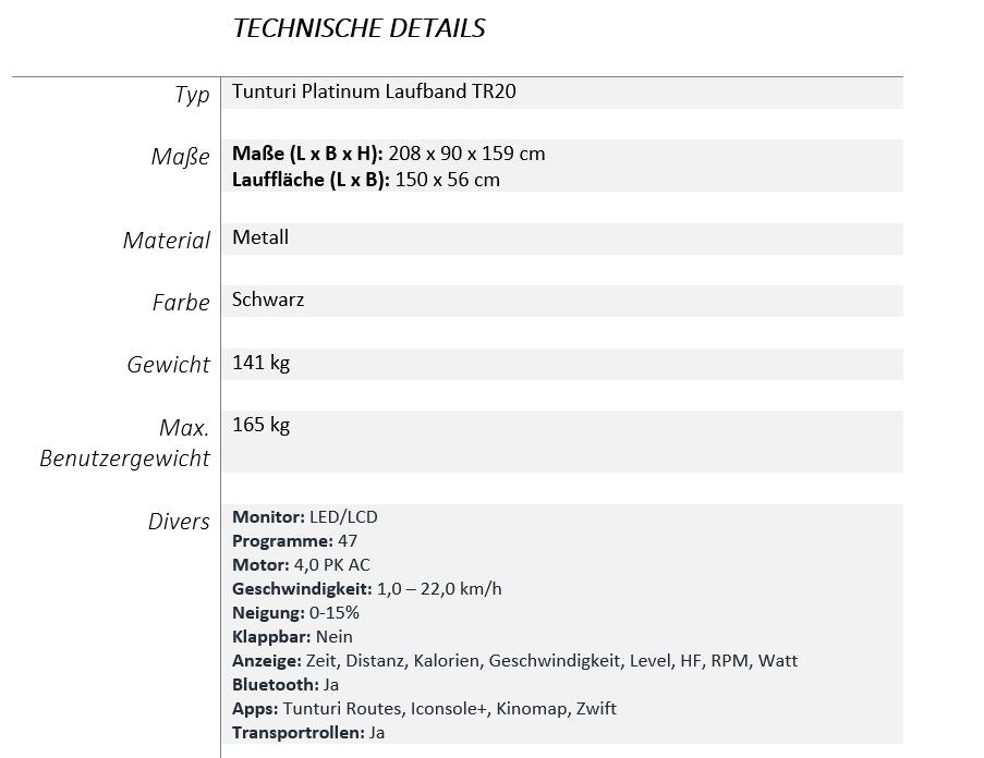 Entdecke die Leistung des Tunturi Platinum T20 Laufbandes für intensive Trainingseinheiten. Mit leisem Motor, sechsteiligem Dämpfungssystem und extra breiter Lauffläche, ideal für Fitnessstudios und Hotels.