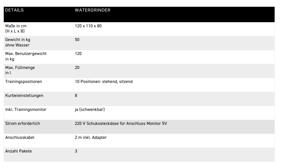 Achtung! Der WaterGrinder benötigt einen Stromanschluss für den Trainingsmonitor.